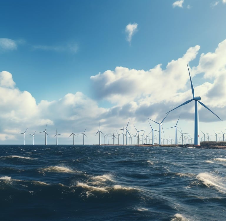 📸 Imagem: @FreePick - By IA - Parque de moinhos de vento offshore com nuvens e um céu azul