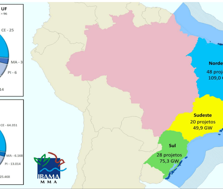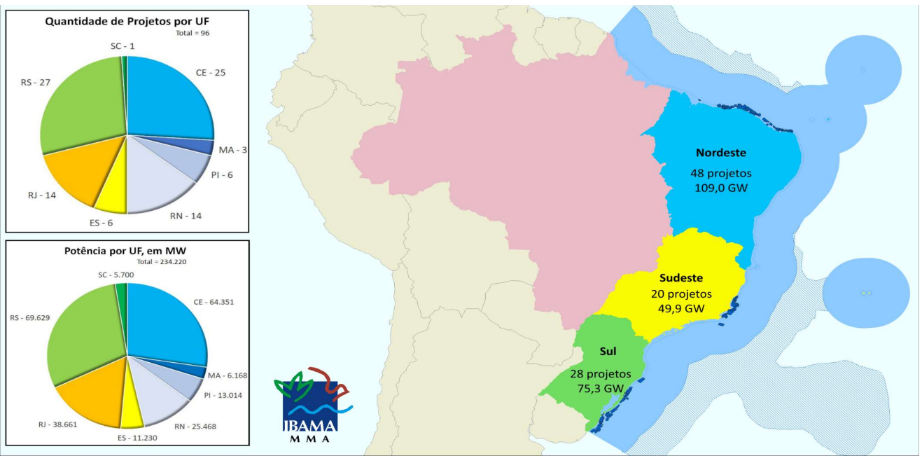 De acordo com o IBAMA - Instituto Brasileiro do Meio Ambiente e dos Recursos Naturais e Renováveis, em sua última atualização, informou que os pedidos de licenciamento para parques eólicos offshore atingiram um impressionante marca de 234,2 gigawatts (GW) de potência, em 96 empreendimentos que pleiteiam a regularização ambiental no órgão que é responsável pelo Licenciamento destes empreendimentos.
